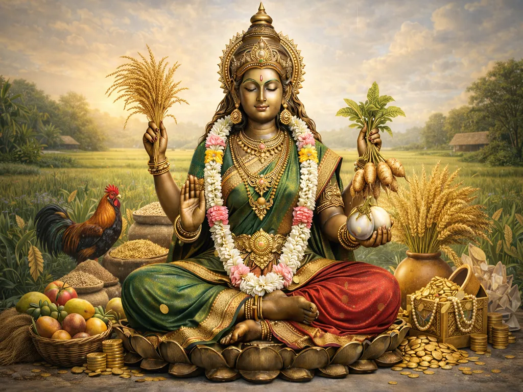 To pray to Dhanya Lakshmi, offer raw rice, green gram, or freshly harvested fruits. Speak your gratitude aloud; for what you’ve eaten, for who you’ve fed, for what grew under your care. She listens to those who understand the value of food beyond taste. Her presence ensures you don’t just have enough; but that you never forget what it means to be fed. She is with every hand that serves with love.