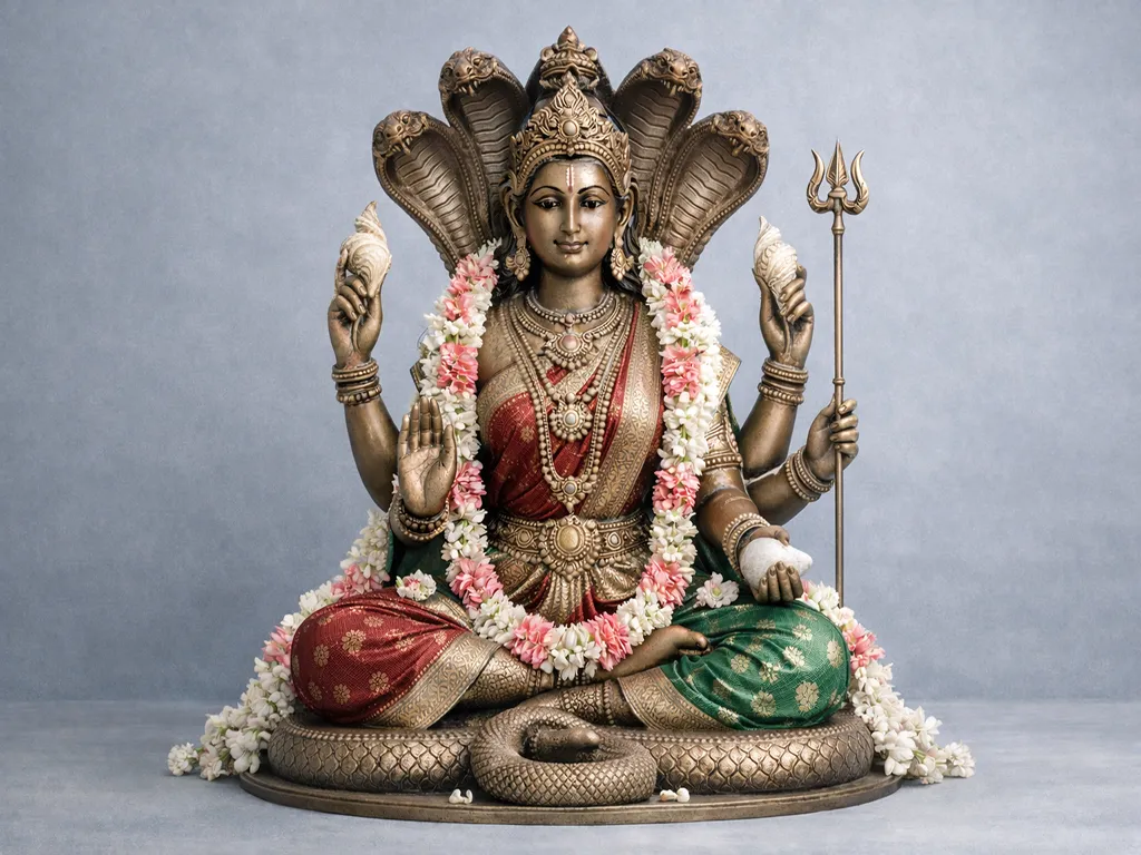 Nagaraja is the source of ancestral wisdom and karmic cleansing. Offer milk and turmeric at his stone idol, especially beneath sacred trees. Pray when generational patterns feel heavy, or when family peace feels blocked. His blessing clears unseen energies that linger across bloodlines, allowing your future to unfold without the weight of unresolved pasts.
